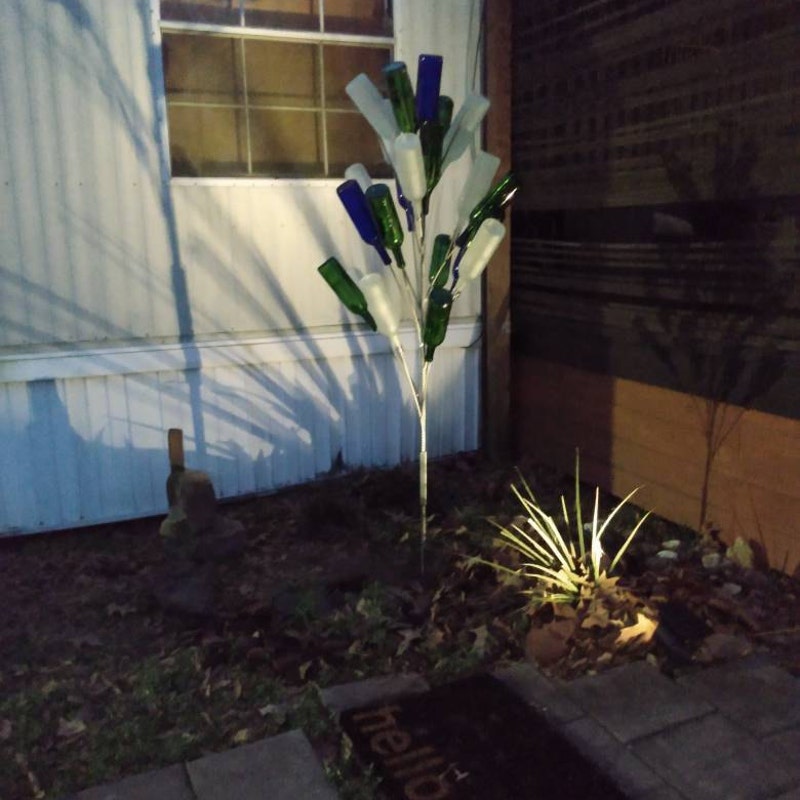 Love this bottle tree so much I bought a second one. You can bend it to look like a real tree. I added solar LED lights to give it some sparkle. Well made with enough room for each bottle to show. I have also hung small glass sun catchers on some of the limbs.