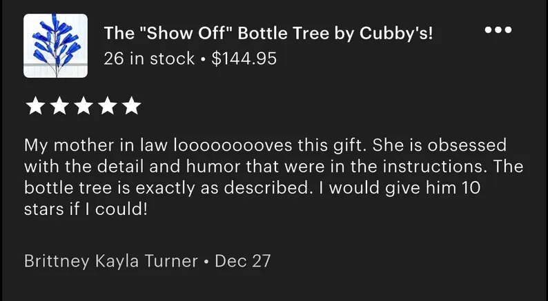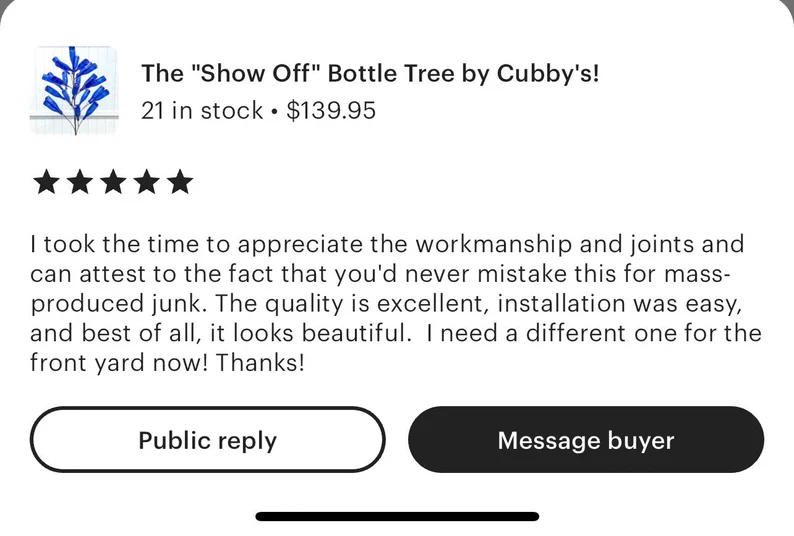 Love the ‘Show Off’ bottle tree. Quality workmanship. Seller goes over and beyond. Exceeded expectations. THANK YOU!!