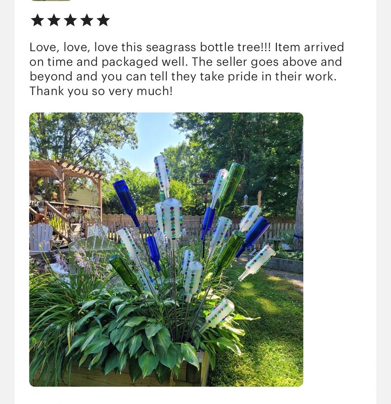 I ordered the large sea grass bottle “tree” and it was promptly delivered. I had a small issue with installation and when I reached out that afternoon, seller’s response was immediate and effective – a replacement part was delivered to the post office before close of business the same day (just before a long holiday weekend). I had the part in less than 48 hours. This bottle tree is exactly what I wanted, well constructed and a bit unusual. It is as outstanding as its maker. Don’t hesitate – if you want a bottle tree for your yard, this is the shop for it!