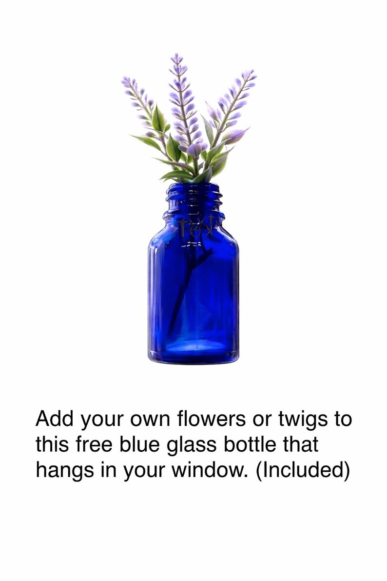 Includes my unique, hanging blue glass bottle for your window to display your small flowers or twigs!