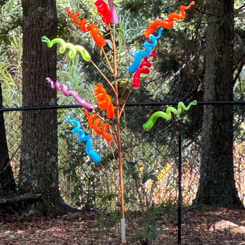 I had previously purchased 12 very cool glass pieces and knew they’d look awesome on a bottle tree…so was delighted to find Cubby’s on Etsy. I ordered two trees – one to gift to my best friend, the other for me. Walt graciously agreed to make my tree with 12 branches – instead of the usual 13 – to fit my collection. I recently “planted” the tree in my back yard and it looks SPECTACULAR!!! Every morning when the sun comes up, the light hits the bottle tree first – and the explosion of color is breathtaking! I couldn’t be happier. My friend is just as excited about her new bottle tree and is already looking for bottles that will make her tree as unique as mine. Walt is all about outstanding customer service and made the entire experience a delight. Thank you SO much, Walt!
